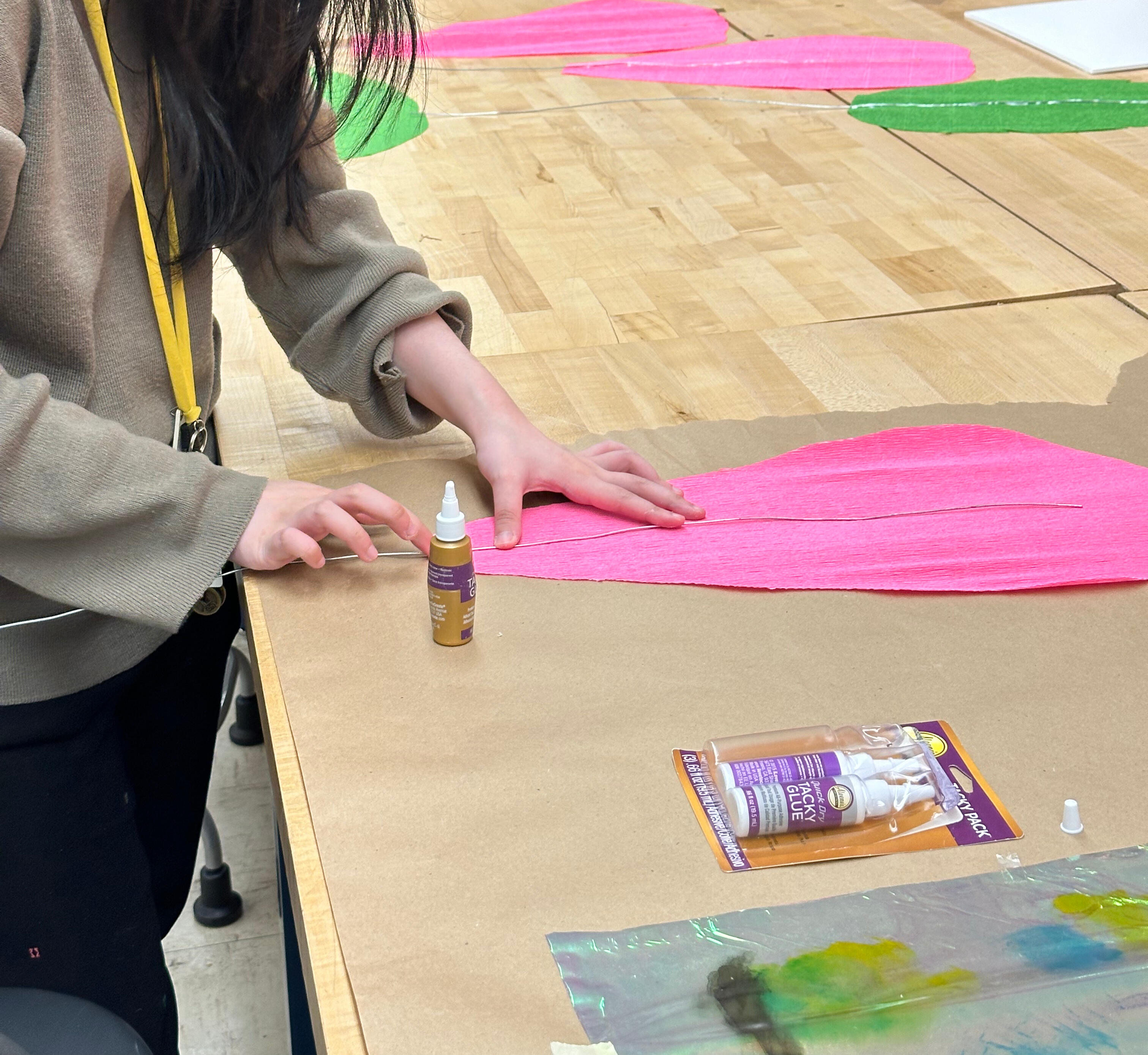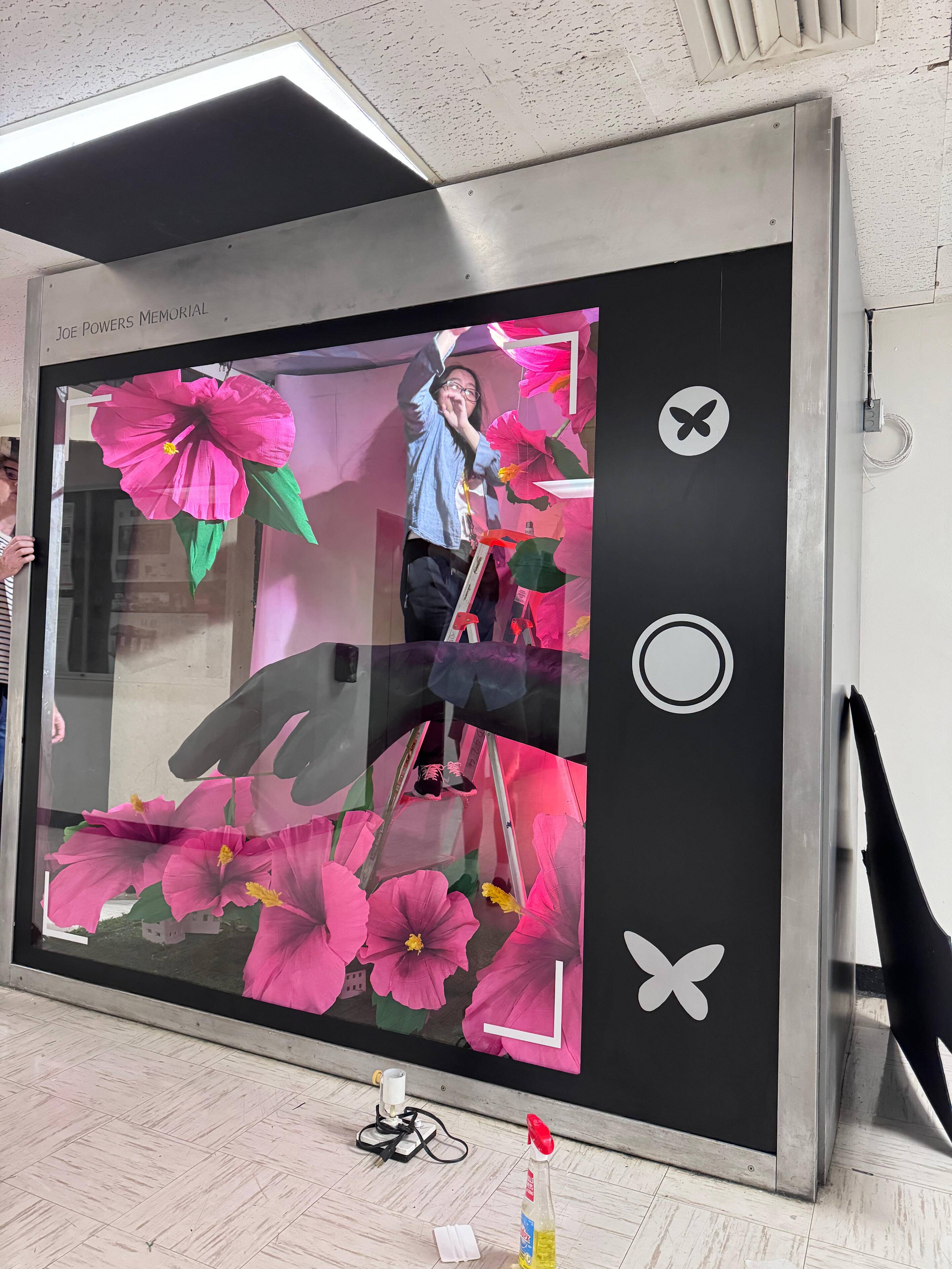 Alongside my team, I fabricated eleven Hibiscus flowers using crepe paper, wire, tacky glue and floral tape. The mannequin’s translucent scales were cut out of iridescent paper. Installation took roughly about a week and a half.