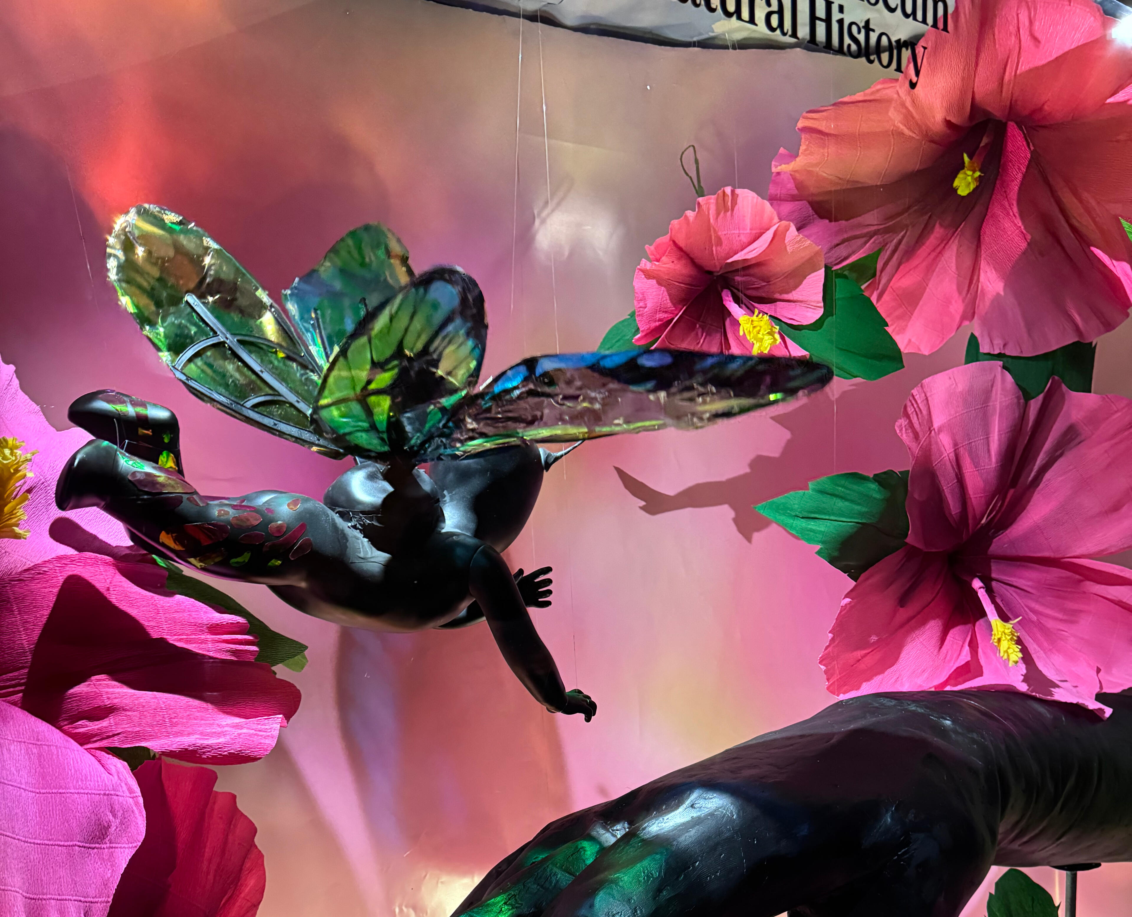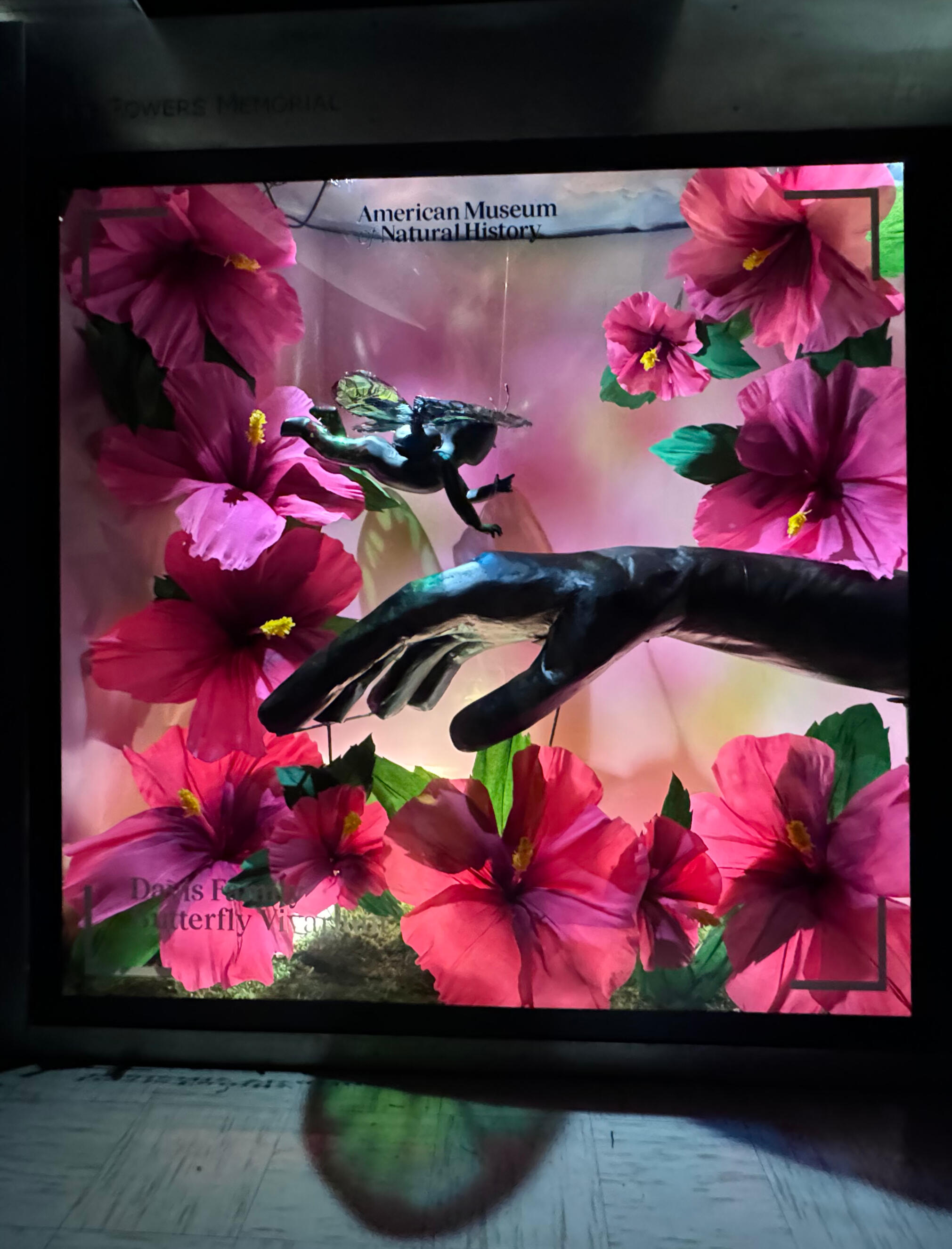 In a team of five, the assignment was to create a large-scale window display promoting the American Museum of Natural History’s Davis Family Vivarium. It was up for a year at the Pomerantz Art and Design Center of Fashion Institute of Technology.Concept, fabrication and installation was accomplished together as a group of five. The window plays around with scale. It imitates the point of view of a butterfly; the proscenium acts as a camera. The hand and the flowers are bigger than life. The mannequin is the focal point and acts as a butterfly.