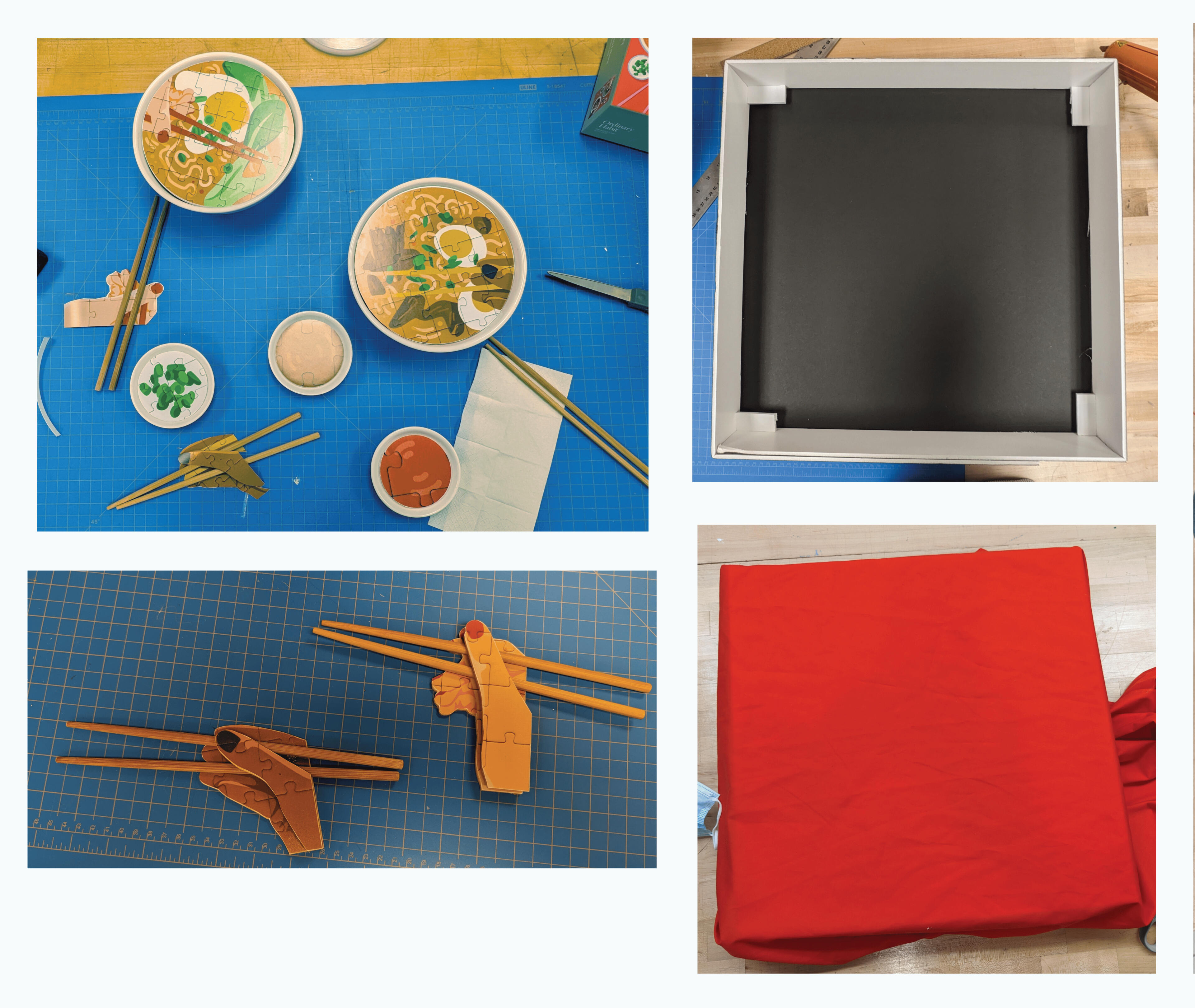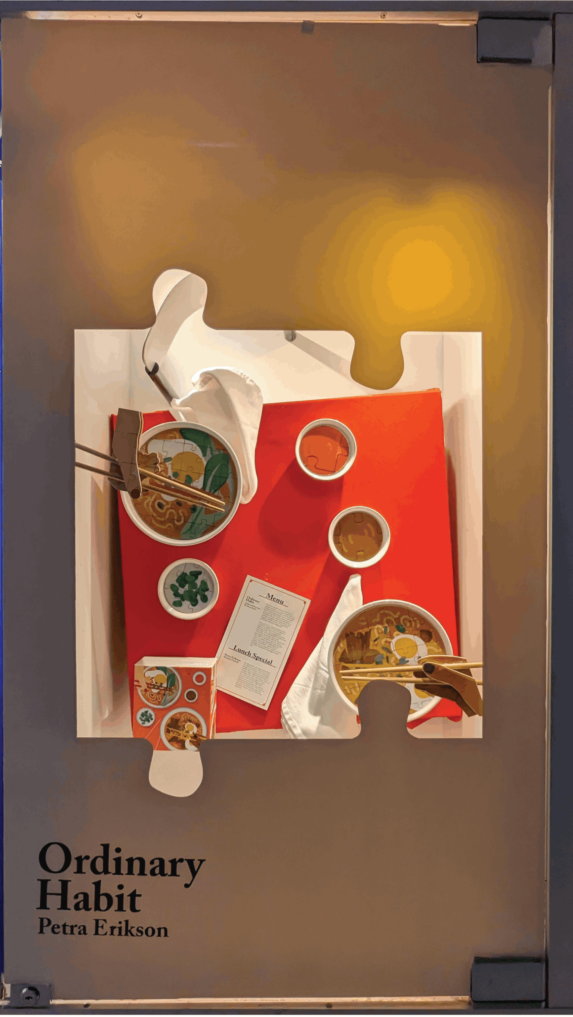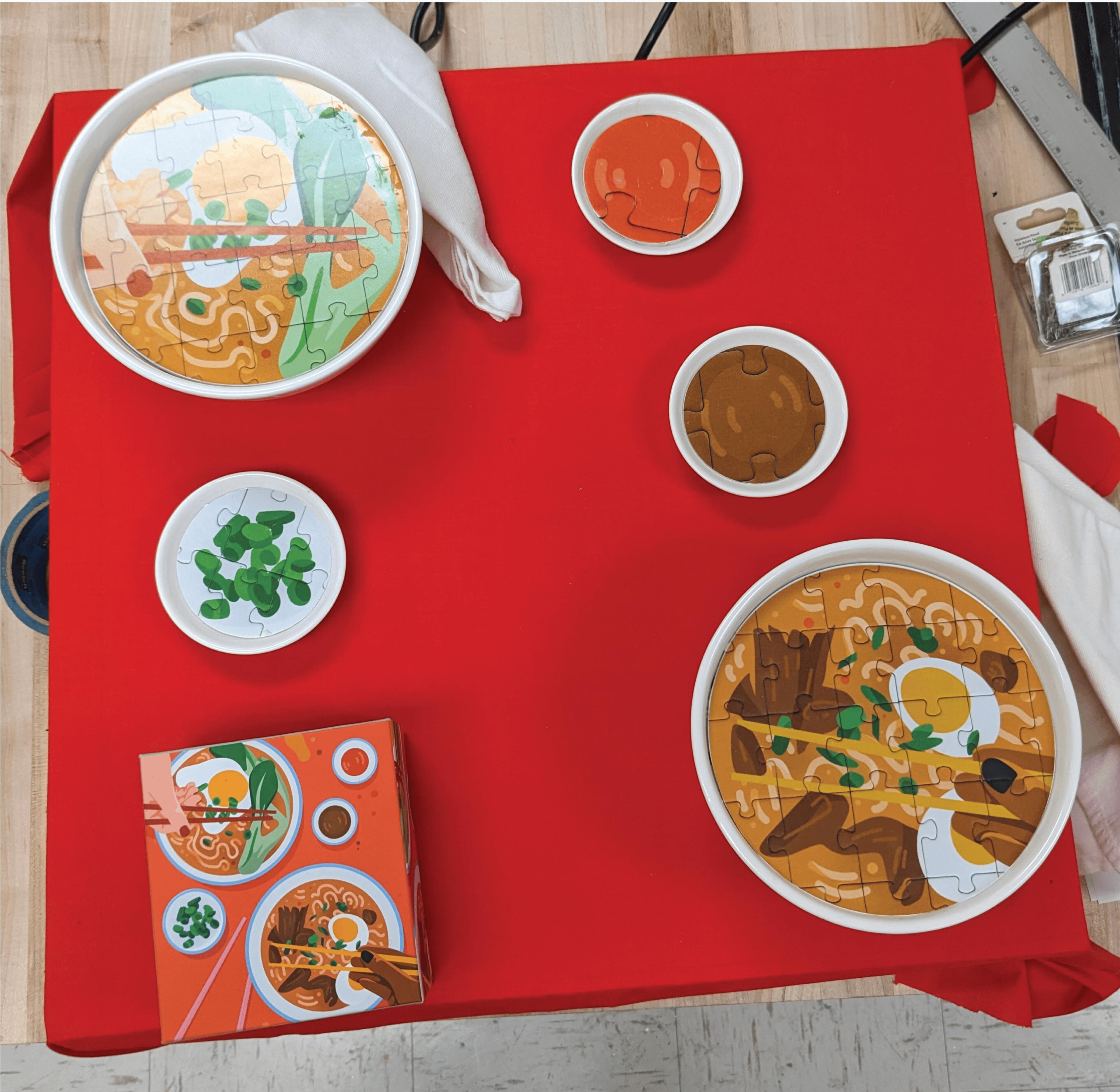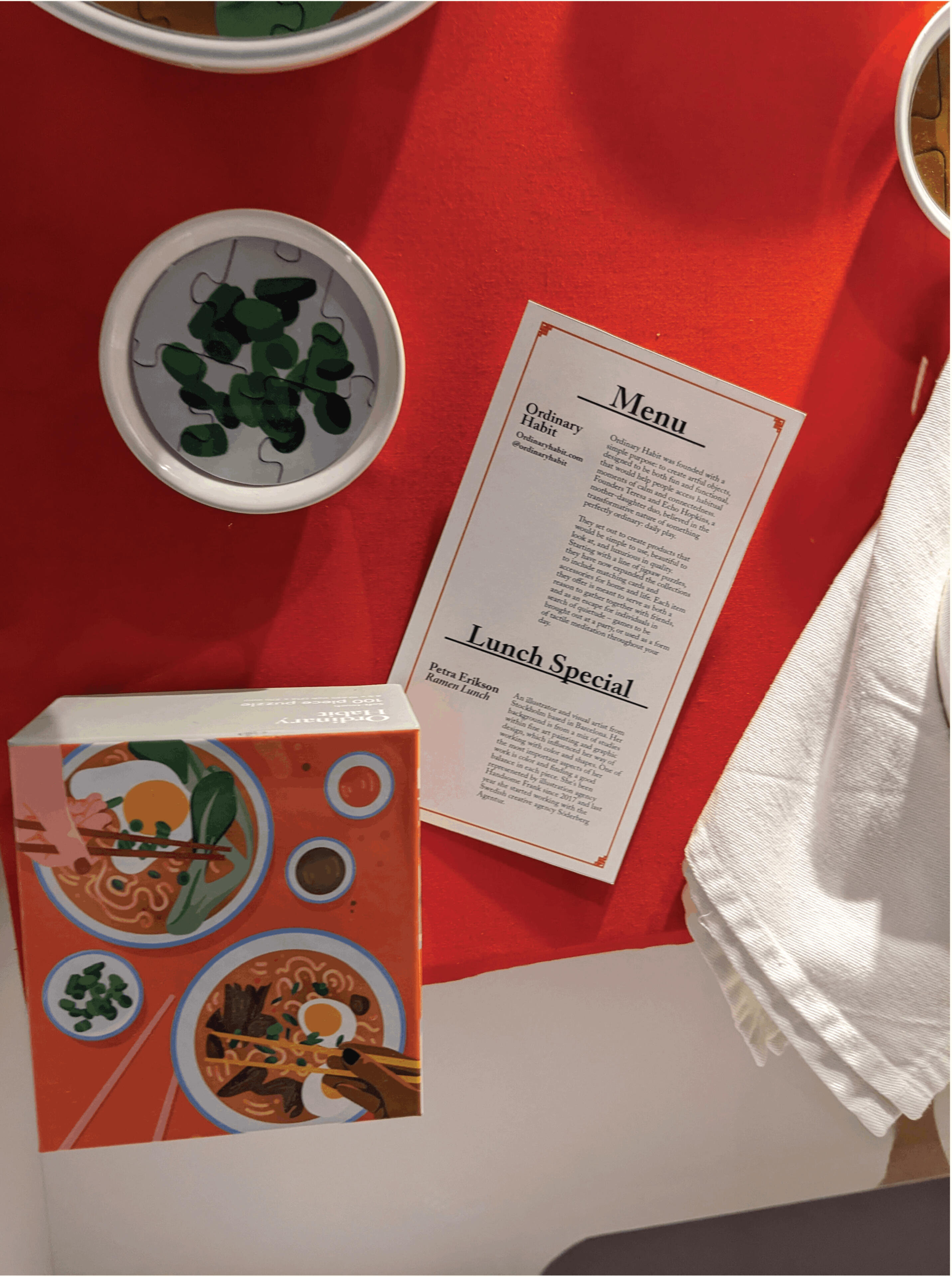 Concept, fabrication and installation was done alone. I did a reinterpretation of one of their puzzles, "Ramen Lunch", incorporating both 3d and 2d elements to recreate the scene without distracting from the product.Additional props, like the chair and napkins, were added to make the scene feel more restaurant-like. I worked with the technician to set up lighting for the window.