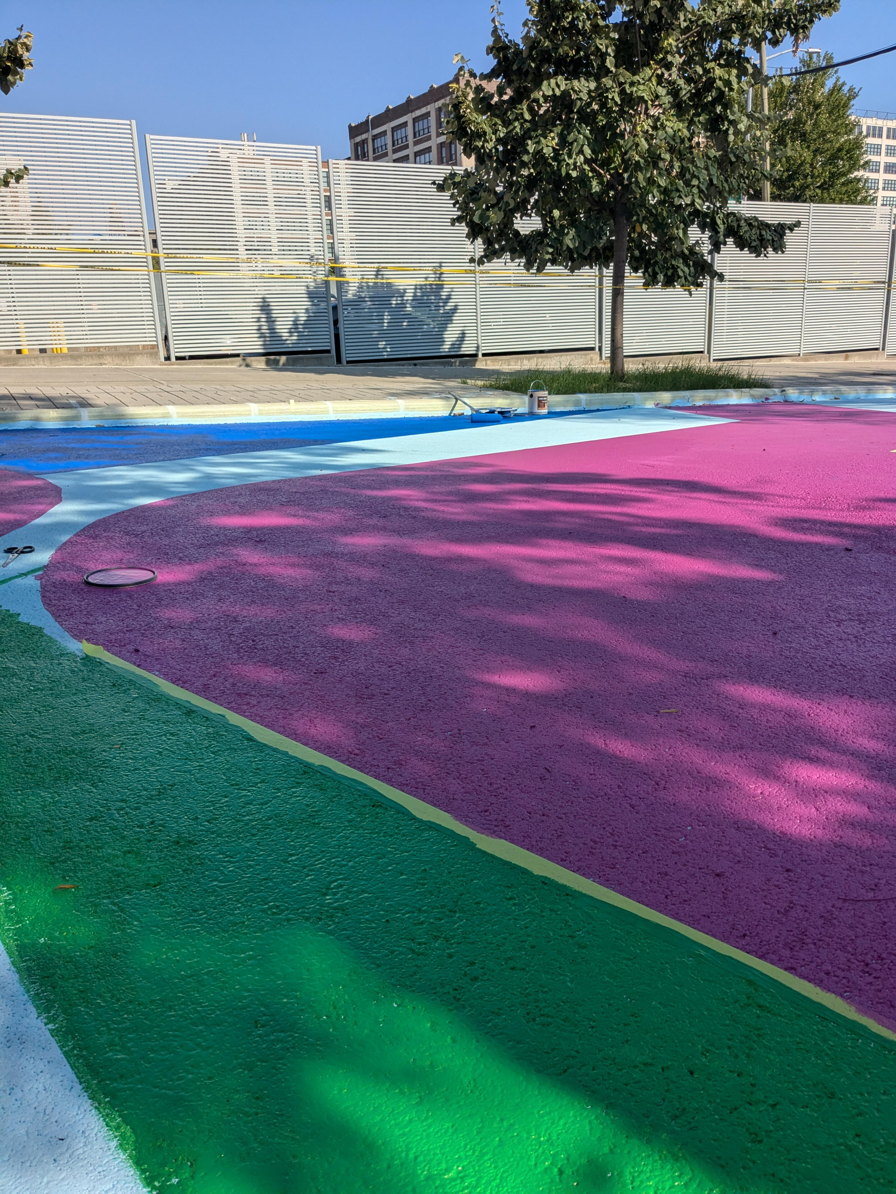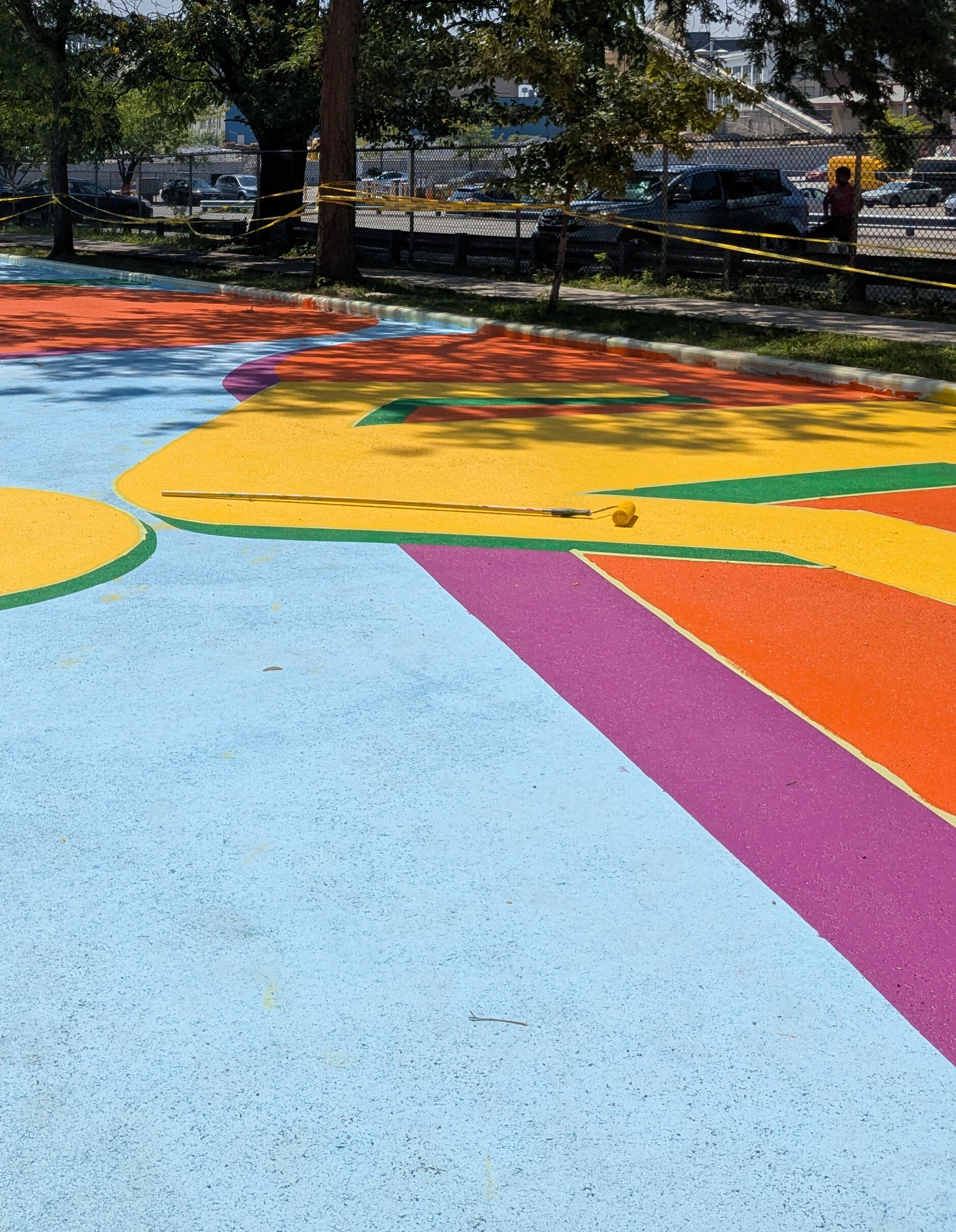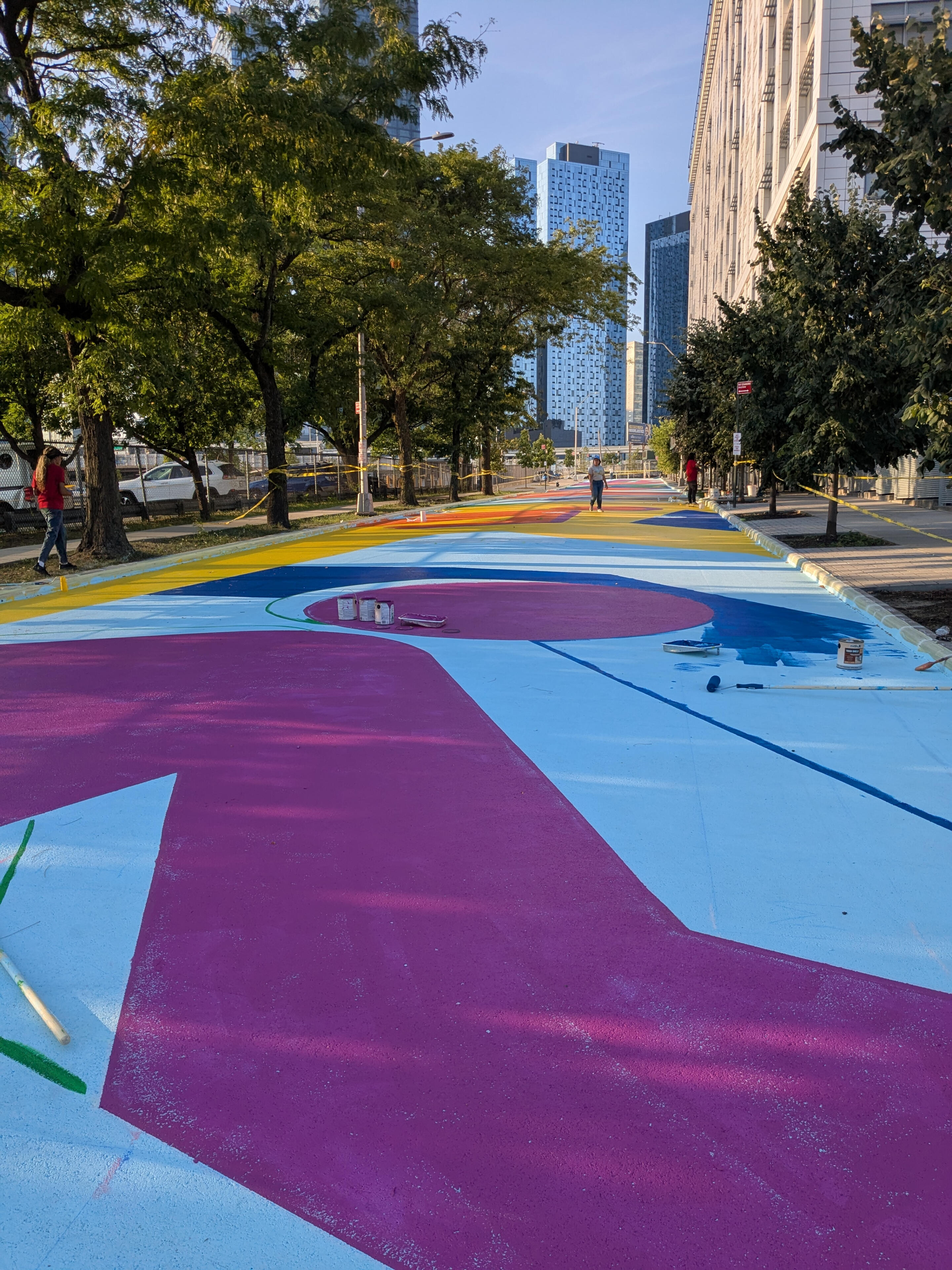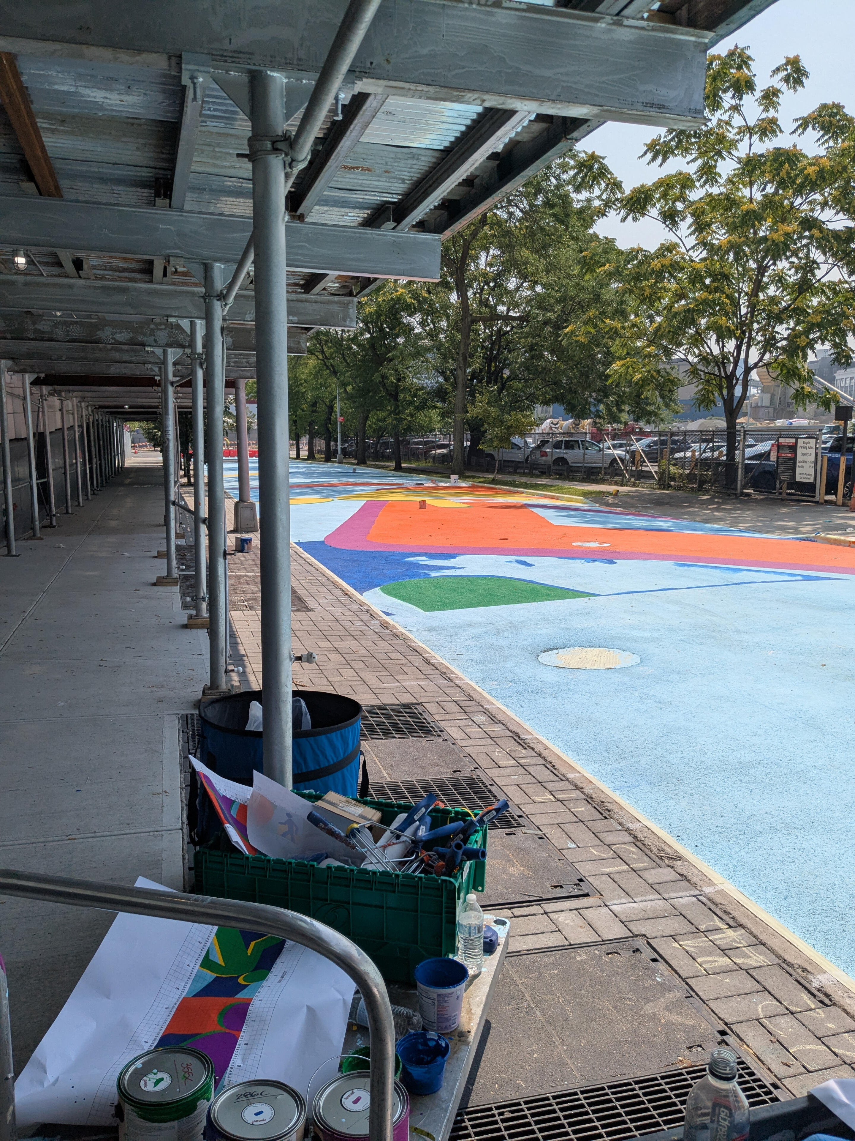 The mural is a collaboration between LaGuardia Community College, DOT, Open Streets, and the Long Island City Partnership (LICP). The process began in July and completed August of 2025.
