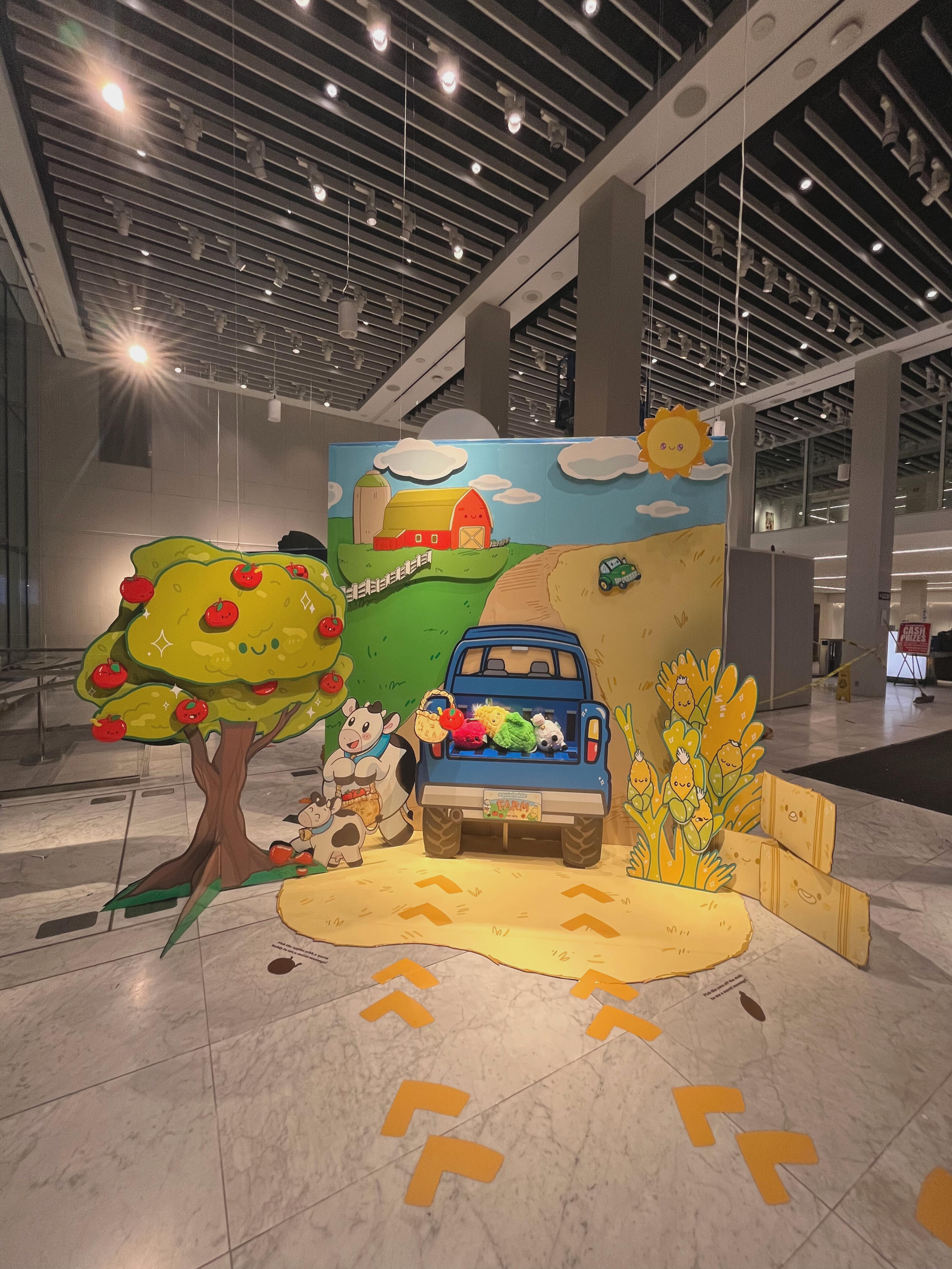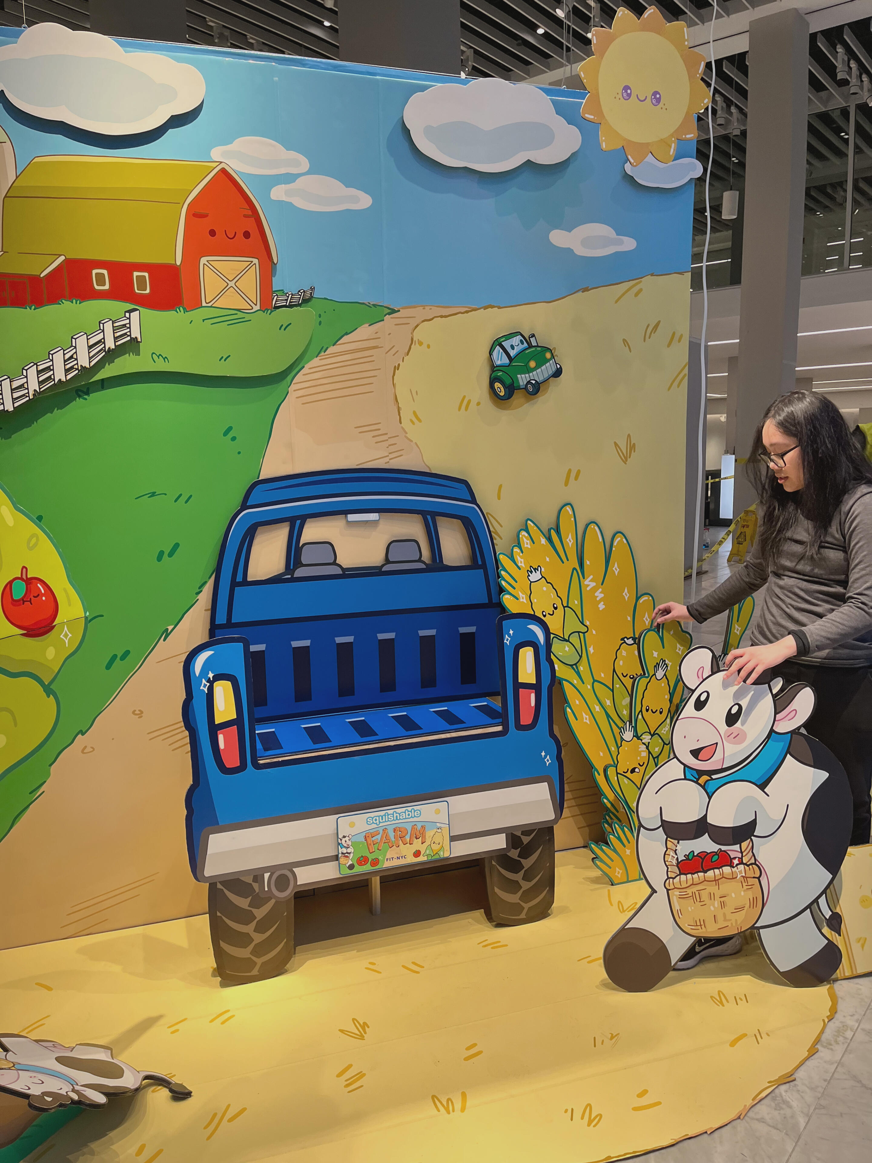 My team was assigned the theme farm and incorporated yellow as our main color. We've brainstormed which interactives we wanted include into our display; the main focus would be a photo moment where visitors can sit down on the back of the "truck". This is done by hiding the bench behind a cutout and covering the top with graphic vinyl. Both the apples on the tree and corn on the stalks are removable. Visitors can flip them to reveal messages on the back.Auditory elements were added to enhance the visitor experience. Animals sounds commonly found in farms such as cows mooing or a rooster crow can be heard while exploring in close proximity.