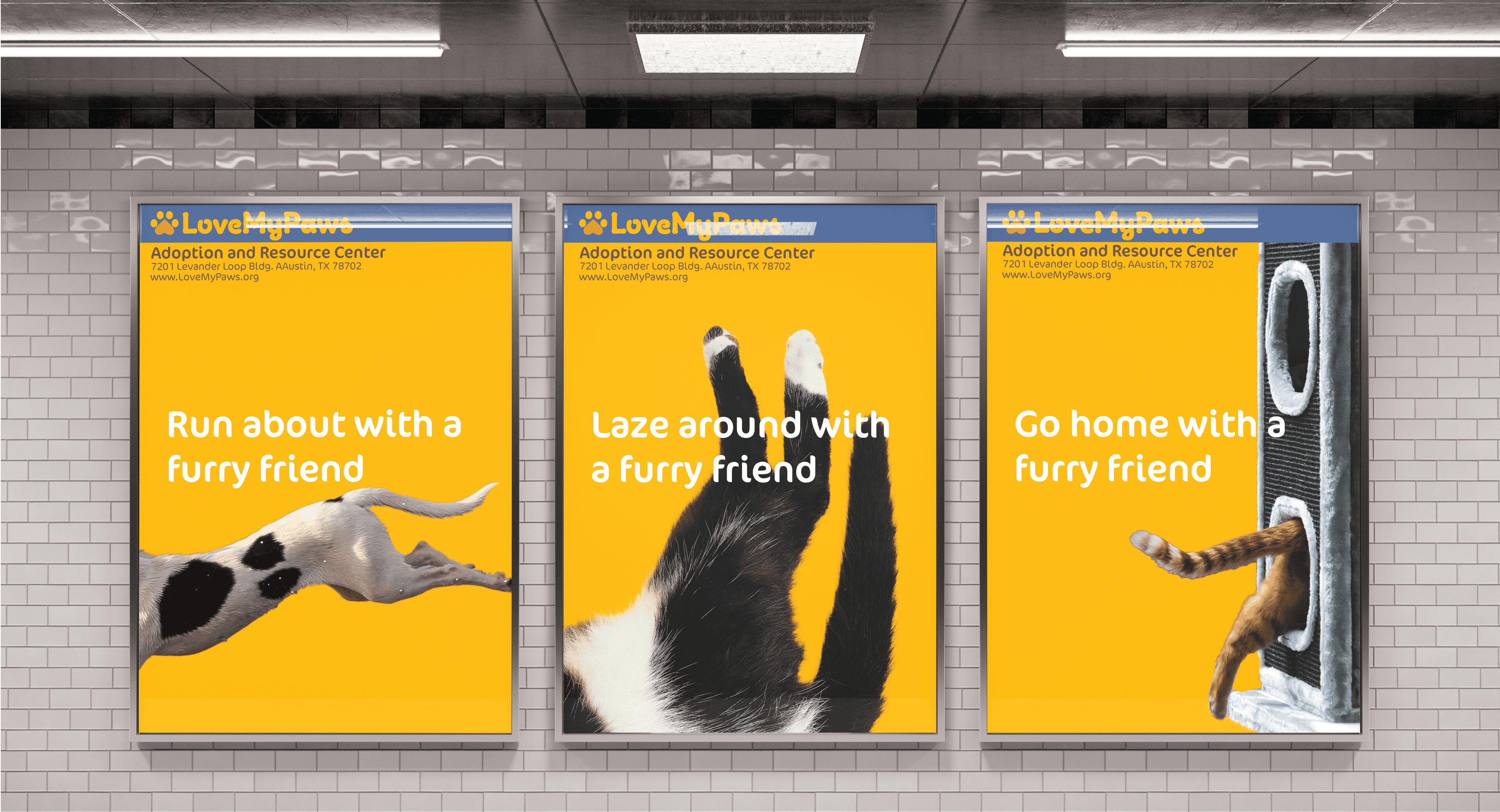 A brand guideline book for spring 2023 capstone. I developed an identity for my brand and included mock ups of the brand's products, advertisements and website.LoveMyPaws is a pet shelter and information center regarding pet care. The goal is to recontextualize the way pet owners see their furry companions.Overview of the project. If project is fictional, use “concept for” in the overview. State the client name, industry, audience, and initial challenge/goal of the project based on the brief. Make each project a story.Do not center-align this text. Do not span the full page width. Adjust the column width and text size to get 50-75 characters per line, then center all text columns on the page.